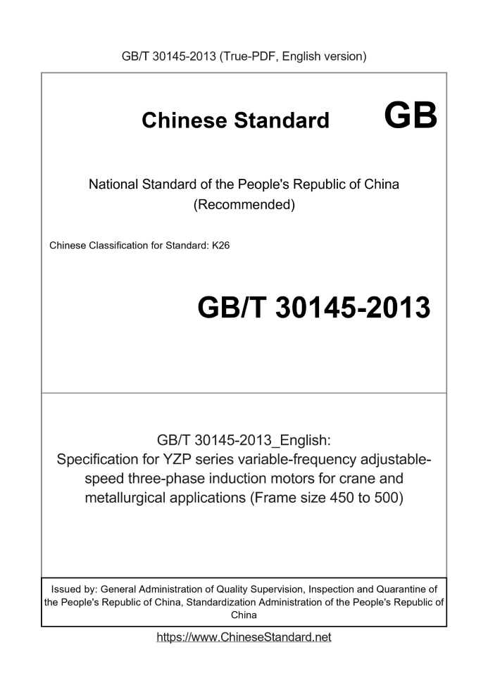 Delivery: <= 3 days. True-PDF full-copy in English will be manually translated and delivered via email. GB/T 30145-2013: Specification for YZP series variable-frequency adjustable-speed three-phase induction motors for crane and metallurgical applications (Frame size 450 to 500) Status: Valid