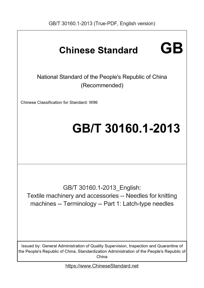 . Textile machinery and accessories Needles for knitting machines Terminology Part 1... Latch-type needles ICS 59.120.40 W96 National Standards of People's Republic of China Textile machinery and accessories knitting machine needle term Part 1. latch needle Terminology-Part 1. Latch-typeneedles (ISO 8119-1. 1989, IDT) Issued on. 2013-12-17 2014-10-15 implementation Administration of Quality Supervision, Inspection and Quarantine of People's Republic of China Standardization Administration of China released
