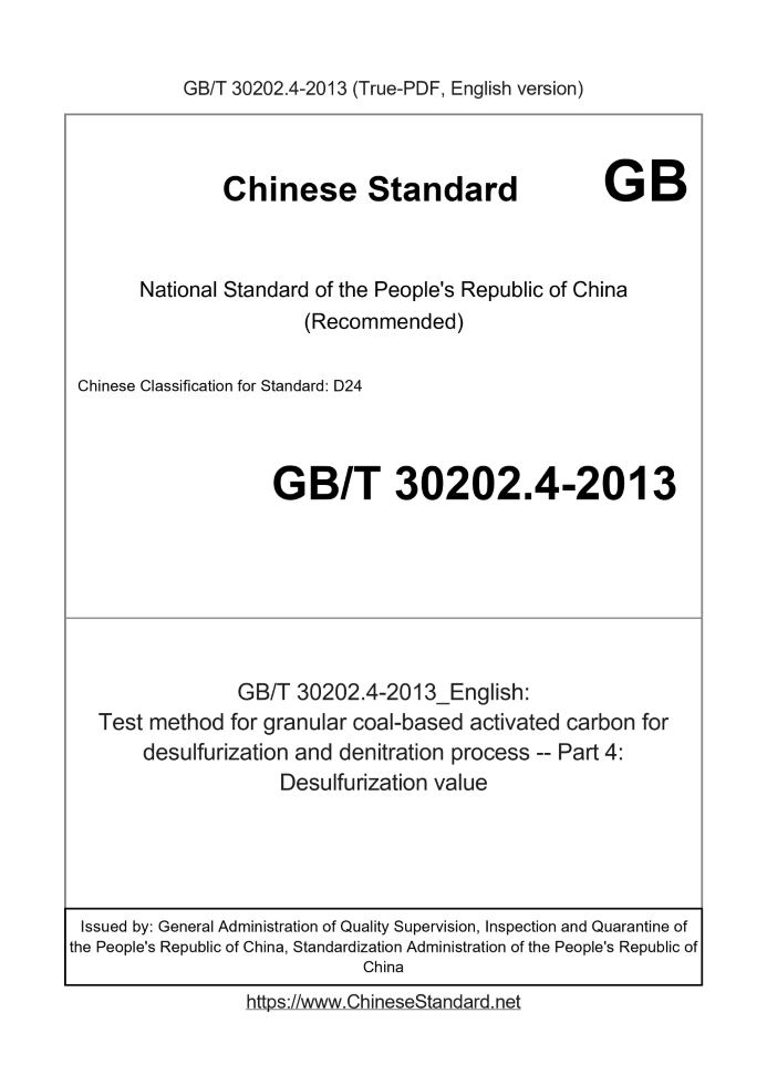 Delivery: <= 3 days. True-PDF full-copy in English will be manually translated and delivered via email. GB/T 30202.4-2013: Test method for granular coal-based activated carbon for desulfurization and denitration process -- Part 4: Desulfurization value Status: Valid