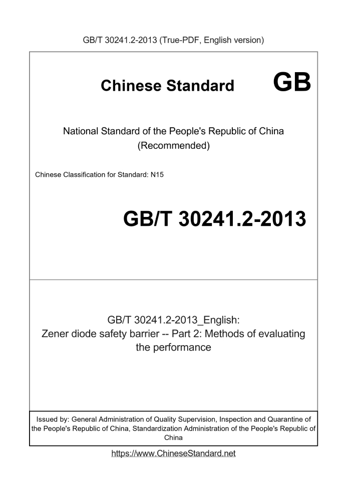 Delivery: <= 3 days. True-PDF full-copy in English will be manually translated and delivered via email. GB/T 30241.2-2013: Zener diode safety barrier -- Part 2: Methods of evaluating the performance Status: Valid