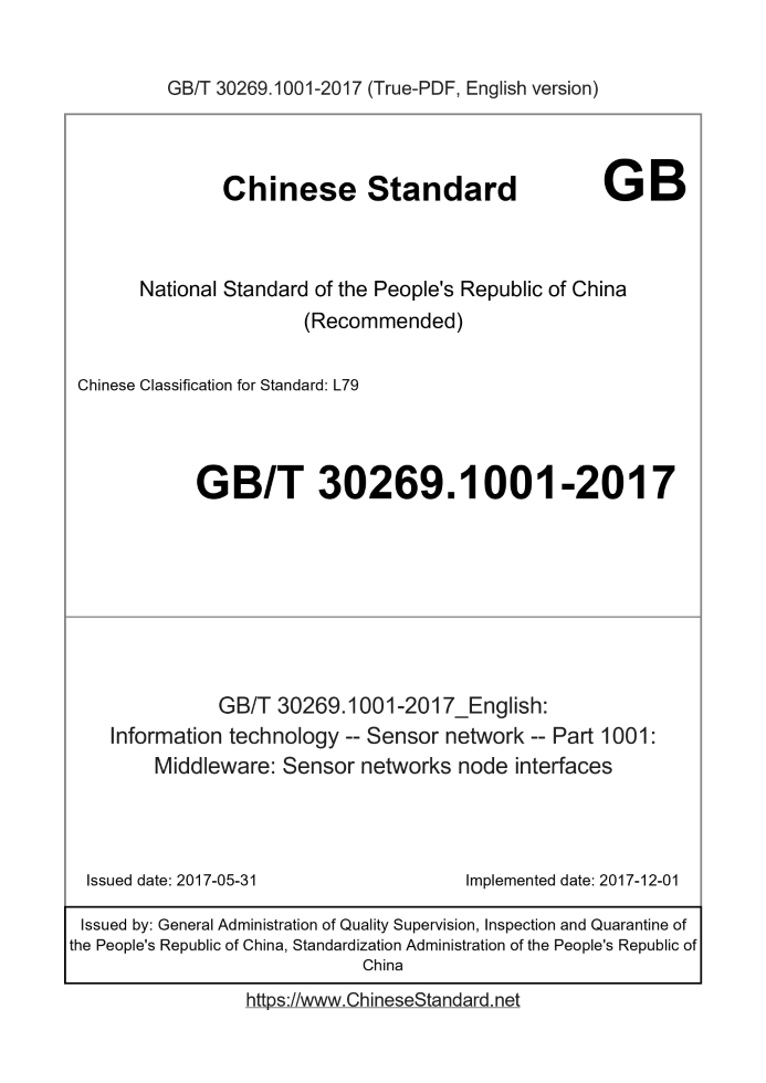 Delivery: <= 3 days. True-PDF full-copy in English will be manually translated and delivered via email. GB/T 30269.1001-2017: Information technology -- Sensor network -- Part 1001: Middleware: Sensor networks node interfaces Status: Valid