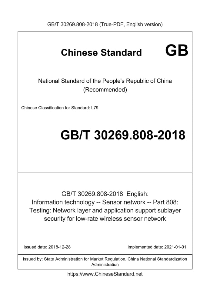 Delivery: <= 10 days. True-PDF full-copy in English will be manually translated and delivered via email. GB/T 30269.808-2018: Information technology -- Sensor network -- Part 808: Testing: Network layer and application support sublayer security for low-rate wireless sensor network Status: Valid