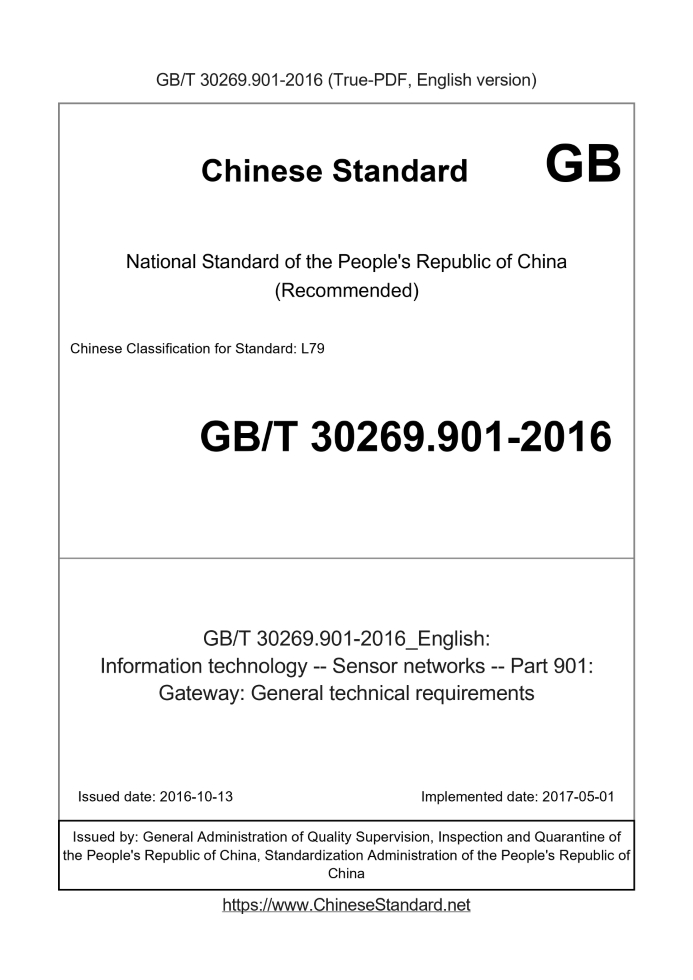 Delivery: <= 3 days. True-PDF full-copy in English will be manually translated and delivered via email. GB/T 30269.901-2016: Information technology -- Sensor networks -- Part 901: Gateway: General technical requirements Status: Valid