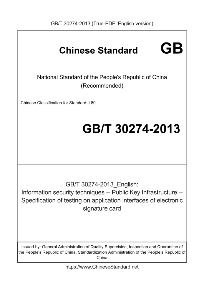 Information security techniques. Public Key Infrastructure. Specification of testing on application interfaces of electronic signature card ICS 35.040 L80 National Standards of People's Republic of China Information security technology - Public key infrastructure Electronic Signature Card Application Interface Specification Test Issued on. 2013-12-31 2014-07-15 implementation Administration of Quality Supervision, Inspection and Quarantine of People's Republic of China Standardization Administration of China released