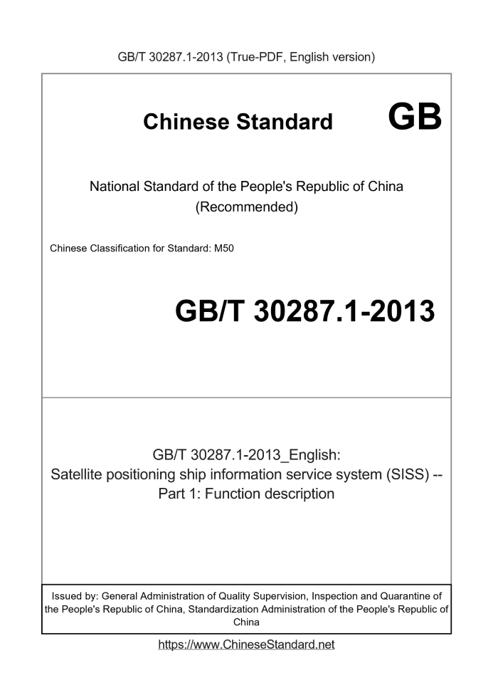 | GB/T 30287.1-2013 English PDFUS$329.00 · In stock Delivery: <= 3 days. True-PDF full-copy in English will be manually translated and delivered via email. GB/T 30287.1-2013: Satellite positioning ship information service system (SISS) -- Part 1: Function description Status: Valid
