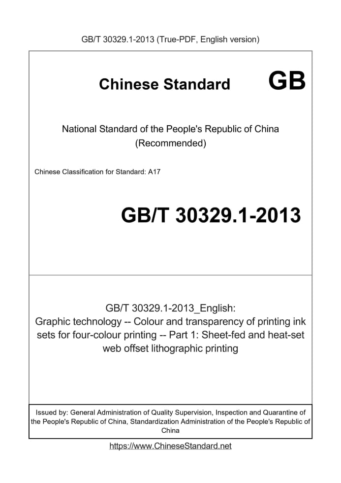 Delivery: <= 3 days. True-PDF full-copy in English will be manually translated and delivered via email. GB/T 30329.1-2013: Graphic technology -- Colour and transparency of printing ink sets for four-colour printing -- Part 1: Sheet-fed and heat-set web offset lithographic printing Status: Valid