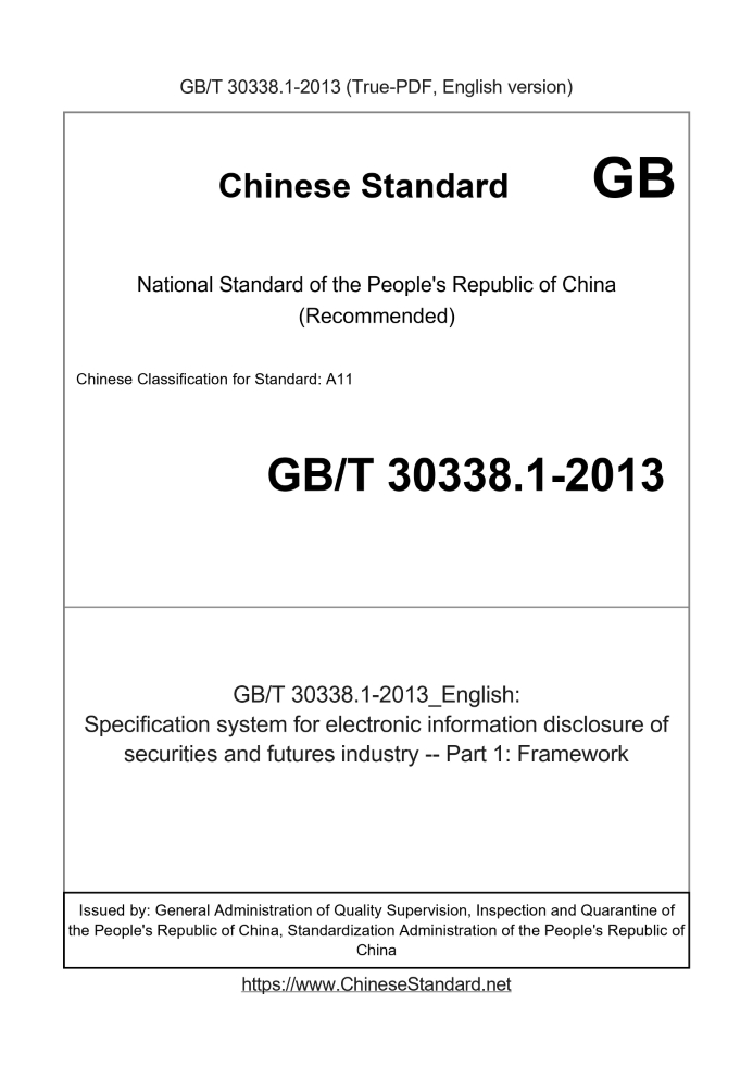 Delivery: <= 4 days. True-PDF full-copy in English will be manually translated and delivered via email. GB/T 30338.1-2013: Specification system for electronic information disclosure of securities and futures industry -- Part 1: Framework Status: Valid
