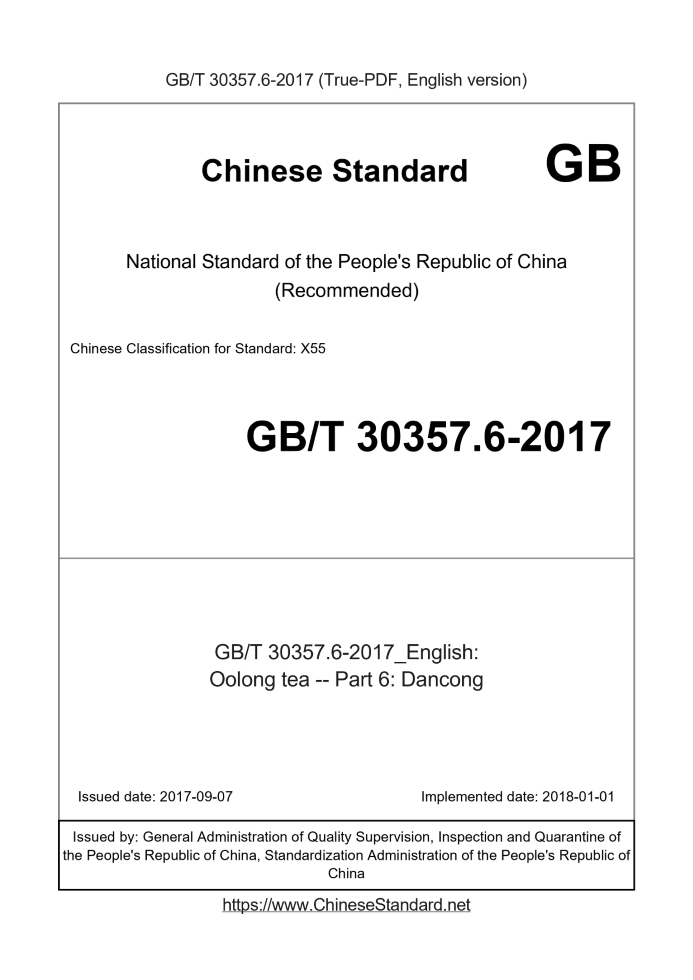 Delivery: <= 3 days. True-PDF full-copy in English will be manually translated and delivered via email. GB/T 30357.6-2017: Oolong tea -- Part 6: Dancong Status: Valid