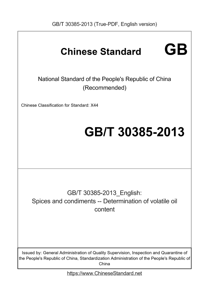 Delivery: <= 3 days. True-PDF full-copy in English will be manually translated and delivered via email. GB/T 30385-2013: Spices and condiments -- Determination of volatile oil content Status: Valid