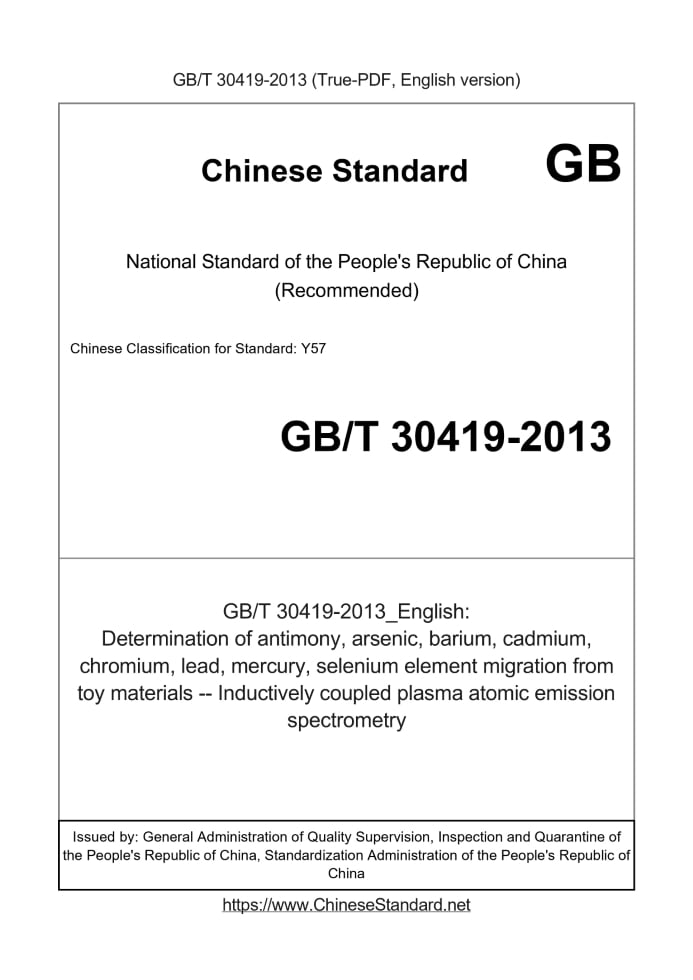 Delivery: <= 3 days. True-PDF full-copy in English will be manually translated and delivered via email. GB/T 30419-2013: Determination of antimony, arsenic, barium, cadmium, chromium, lead, mercury, selenium element migration from toy materials -- Inductively coupled plasma atomic emission spectrometry Status: Valid