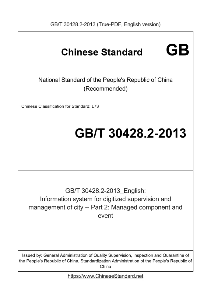Delivery: <= 5 days. True-PDF full-copy in English will be manually translated and delivered via email. GB/T 30428.2-2013: Information system for digitized supervision and management of city -- Part 2: Managed component and event Status: Valid