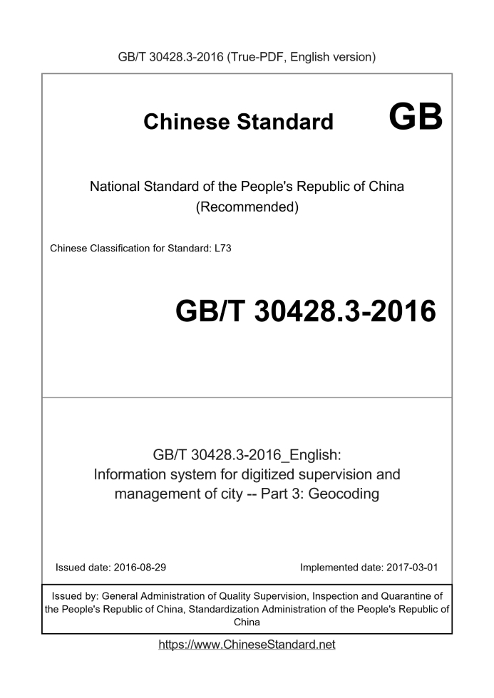 Delivery: <= 4 days. True-PDF full-copy in English will be manually translated and delivered via email. GB/T 30428.3-2016: Information system for digitized supervision and management of city -- Part 3: Geocoding Status: Valid