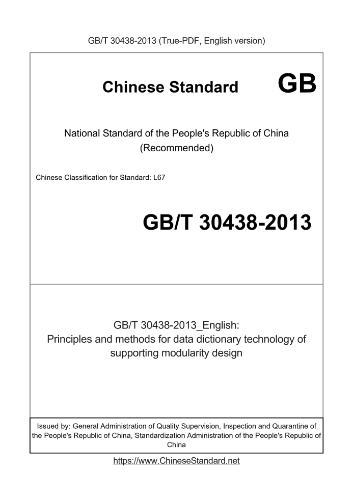 Delivery: <= 3 days. True-PDF full-copy in English will be manually translated and delivered via email. GB/T 30438-2013: Principles and methods for data dictionary technology of supporting modularity design Status: Valid