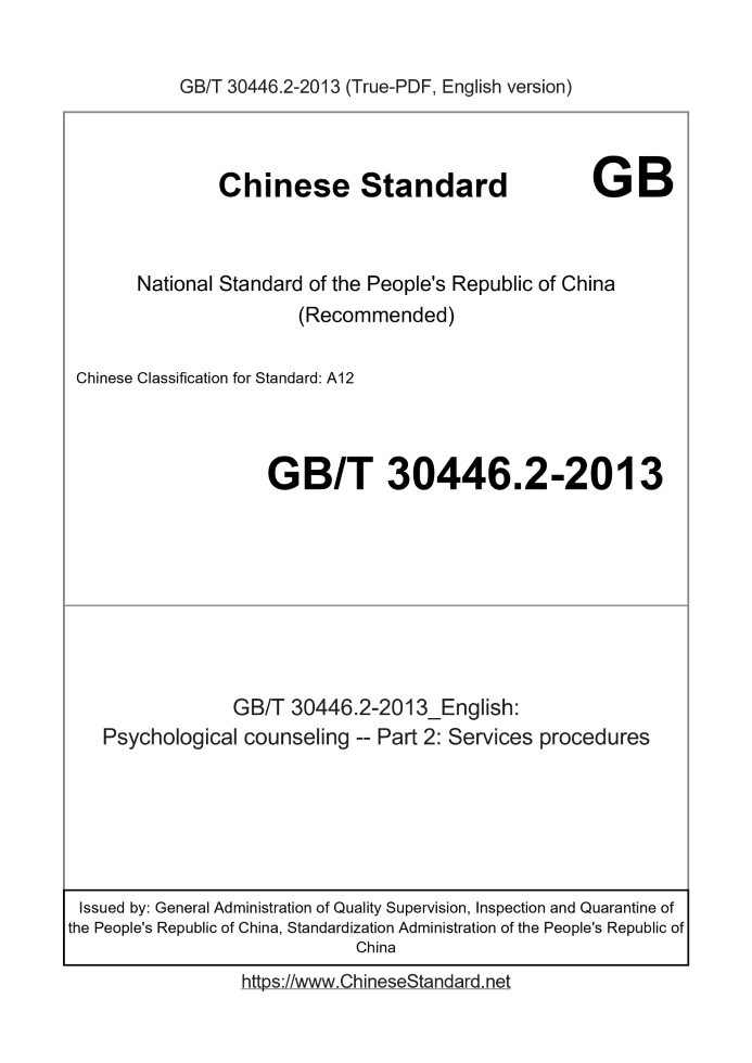 Delivery: <= 3 days. True-PDF full-copy in English will be manually translated and delivered via email. GB/T 30446.2-2013: Psychological counseling -- Part 2: Services procedures Status: Valid