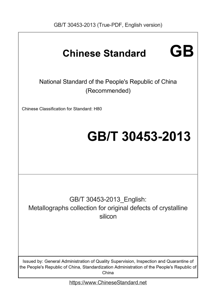 Delivery: <= 13 days. True-PDF full-copy in English will be manually translated and delivered via email. GB/T 30453-2013: Metallographs collection for original defects of crystalline silicon Status: Valid