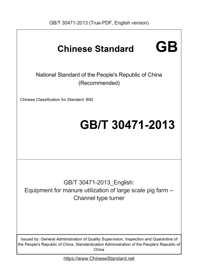 Delivery: <= 3 days. True-PDF full-copy in English will be manually translated and delivered via email. GB/T 30471-2013: Equipment for manure utilization of large scale pig farm -- Channel type turner Status: Valid