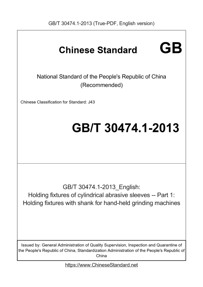 Delivery: <= 3 days. True-PDF full-copy in English will be manually translated and delivered via email. GB/T 30474.1-2013: Holding fixtures of cylindrical abrasive sleeves -- Part 1: Holding fixtures with shank for hand-held grinding machines Status: Valid