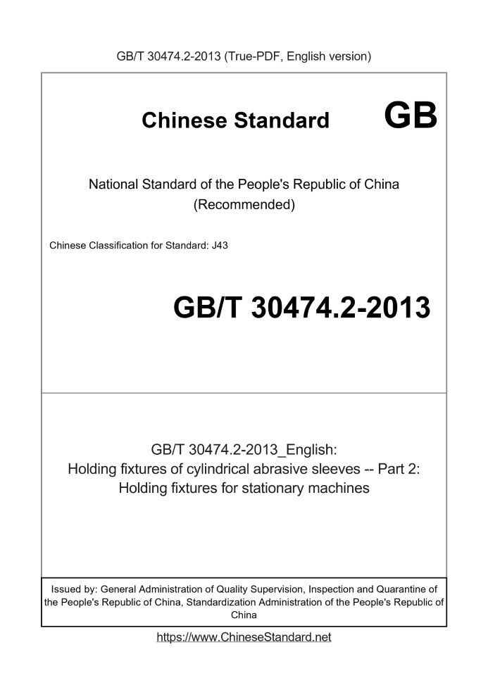 Delivery: <= 3 days. True-PDF full-copy in English will be manually translated and delivered via email. GB/T 30474.2-2013: Holding fixtures of cylindrical abrasive sleeves -- Part 2: Holding fixtures for stationary machines Status: Valid