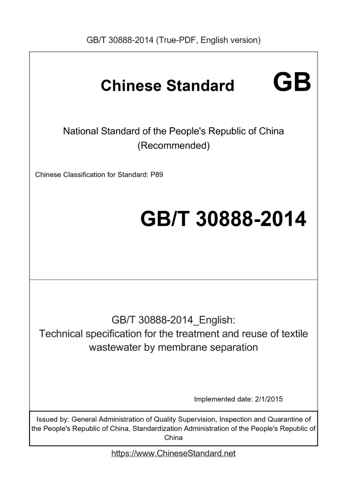 Delivery: <= 3 days. True-PDF full-copy in English will be manually translated and delivered via email. GB/T 30888-2014: Technical specification for the treatment and reuse of textile wastewater by membrane separation Status: Valid