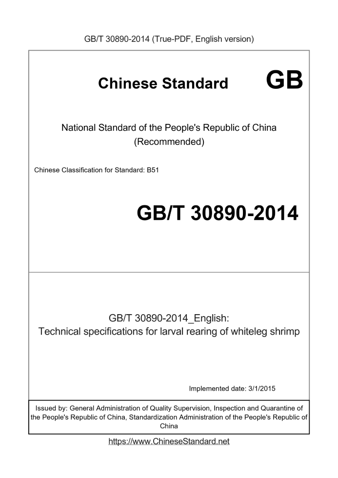 Delivery: <= 3 days. True-PDF full-copy in English will be manually translated and delivered via email. GB/T 30890-2014: Technical specifications for larval rearing of whiteleg shrimp Status: Valid