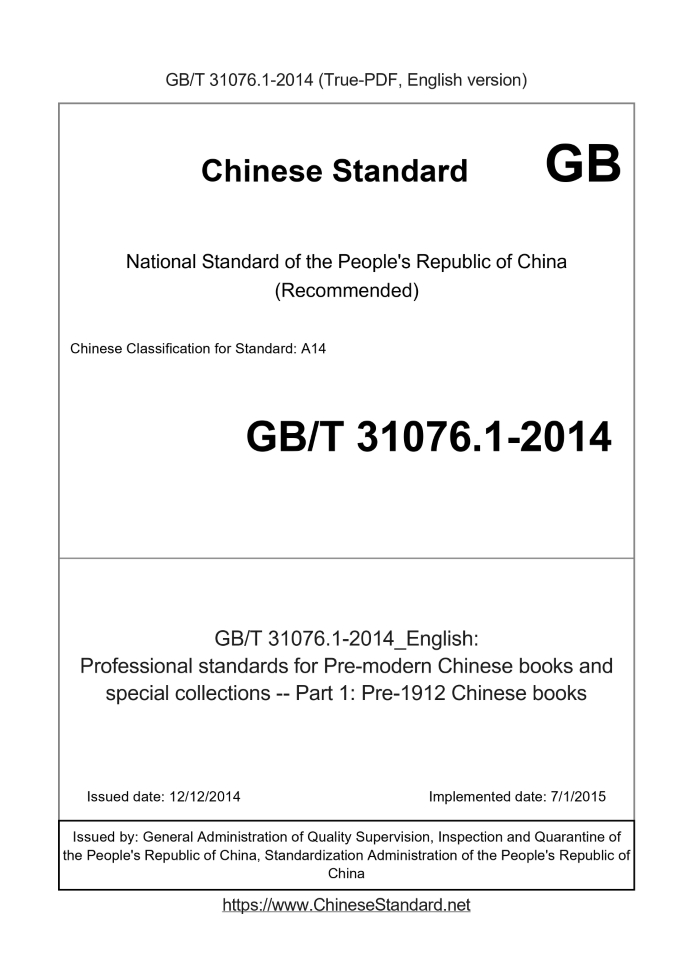 Delivery: <= 3 days. True-PDF full-copy in English will be manually translated and delivered via email. GB/T 31076.1-2014: Professional standards for Pre-modern Chinese books and special collections -- Part 1: Pre-1912 Chinese books Status: Valid