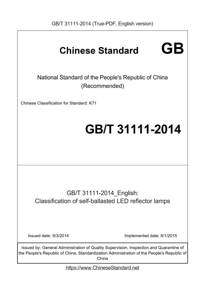 Delivery: <= 3 days. True-PDF full-copy in English will be manually translated and delivered via email. GB/T 31111-2014: Classification of self-ballasted LED reflector lamps Status: Valid