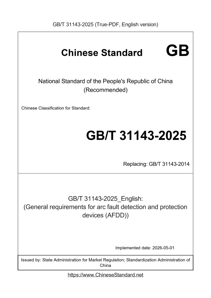 Basic dataStandard ID: GB/T 31143-2025 (GB/T31143-2025)Description (Translated English): (General requirements for arc fault detection and protection devices (AFDD)) Sector / Industry: National Standard (Recommended) Date of Implementation: 2026-05-01 Older Standard (superseded by this standard): GB/T 31143-2014 Issuing agency(ies): State Administration for Market Regulation; Standardization Administration of China GB/T 31143-2014: General requirements for arc fault detection devices (AFDD)---This is a DRAFT version for illustration, not a final translation. Full copy of true-PDF in English version (including equations, symbols, images, flow-chart, tables, and figures etc.) will be manually/carefully translated upon your order.General requirements for arc fault detection devices (AFDD) ICS 29.120.50 K31 National Standards of People's Republic of China Electric arc fault protection (AFDD) General requirements (IEC 62606.2013, MOD) Issued on. 2014-09-03 2015-04-01 implementation Administration of Quality Supervision, Inspection and Quarantine of People's Republic of China Standardization Administration of China released Table of ContentsIntroduction Ⅴ Introduction Ⅵ 1 Scope 1 2 Normative references 1 3 Terms and definitions 2 4 Category 4 4.1 According to the structure by type 4 4.2 Depending on the installation and connection points 4 4.3 according to the number of poles and current paths 5 stars 4.4 provides monitoring information AFDD 5 5 Characteristics 5 AFDD 5.1 Summary of characteristics and reduce fire danger conditions 5 5.2 rated capacity and other features 5 5.3 standard values \u200b\u200band preferred values \u200b\u200b6 Standard 5.4 Rated impulse withstand voltage (Uimp) 8 value 5.5 and short-circuit protection (SCPD) coordination 8 6 Marking and other product information 9 6.1 mark 9 Notations 6.2 4.1.1 Classification of AFDD 10 7 and 11 of the standard operating conditions Installation 7.1 standard conditions 11 7.2 Installation conditions 11 7.3 Pollution Level 11 Construction and operation of claim 8 12 8.1 Overview 12 8.2 Mechanical Design 12 17 8.3 Protection against electric shock 8.4 dielectric properties and isolation 17 8.5 Temperature Rise 17 8.6 Operating characteristics 18 8.7 Mechanical and electrical endurance 19 8.8 Performance under short-circuit current 19 8.9 Resistance to mechanical shock and impact performance 19 8.10 Heat 19 8.11 Resistance to abnormal heat and fire 19 AFDD characteristic is the main circuit overcurrent 19 8.12 8.13 by the impulse voltage characteristic is caused by the surge current AFDD 19 8.14 Reliability 19 8.15 Electromagnetic compatibility (EMC) 19 8.16 when the load-side connection of various electrical appliances properly shielded test operation 20 8.17 AFD performance test apparatus 20 20 9 Test Program 9.1 Overview 20 9.2 Test conditions 21 Durability Test 9.3 marks 22 9.4 Screws, current-carrying parts and connection reliability test 22 9.5 Reliability Test terminals for external wiring 23 9.6 Protection against electric shock verification 24 9.7 Dielectric properties verification 24 9.8 Temperature Rise Test 30 9.9 Verification of the operating characteristic 30 9.10 Verify mechanical and electrical life 35 9.11 In the case of short-verification status AFDD 36 9.12 Verify resistance to mechanical vibration and impact 42 Heat test 44 9.13 9.14 Resistance to abnormal heat and fire 44 9.15 Verify trip-free mechanism 45 Rust test 45 9.16 9.17 validation when an overcurrent, non-operating current limit 45 9.18 Verify impulse voltage surge current generated under the action of the 46 performance AFDD 9.19 verify the reliability 46 9.20 Verify anti-aging properties of electronic components 48 9.21 Electromagnetic compatibility (EMC) 48 9.22 verification system due to over-voltage three-phase neutral line is disconnected due to protection 51 Number of test procedures in Appendix A (normative) certification test and test 73 Appendix B (normative) determining clearances and creepage distances 80 Annex C (normative) Circuit Test in free gas injection device 85 is detected Annex D (normative) 4.1.3 classification by main special protective equipment (CB or RCCB or RCBO) assembled on site Additional requirements and test the 87 AFDD Appendix E (normative) Routine tests 91 Annex F (informative) 9.10.2 arc described vibration test 92 Annex G (informative) method to determine the short-circuit power factor of 94 Appendix H (informative) Example 95 terminal design Annex I (Information Appendix) ISO and controls 98 AWG copper conductors Appendix J (Informative Appendix) AFDD of follow-up testing 99 SCPD Annex K (informative) 102 short-circuit test Annex L (normative) having to connect an external copper conductors without screw-type terminal 104 special requirements of AFDD Particular requirements for Annex M (normative) with flat ends of the quick connect 111 AFDD Annex N (normative) having an external connection of untreated aluminum wire and screw-type terminal connection of copper or aluminum conductors Particular requirements for aluminum screw-type terminal 117 AFDD References 126ForewordThis standard was drafted in accordance with GB/T 1.1-2009 given rules. This standard uses redrafted law modifying the International Electrotechnical Commission IEC 62606.2013 "Electric arc fault protection (AFDD) General requirements "first edition. This standard and IEC 62606.2013 as compared to the main differences are as follows. --- Deleted and independent of other countries note. --- Deleting requirements and testing under the rated voltage of 120V. --- Table 1 inject a. Description test is expected arc current arc current occurs before the test circuit, and electrical test Table 3 Arc current provisions of the same. 9.9.2.1 At the same time, by deleting "consider the value to the arc voltage during the test, by applying the rated voltage Reduce 50V, for current adjustment test sample when the cable is no arcing. "Some test methods involving m