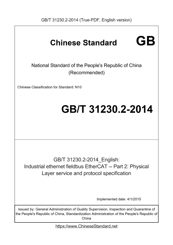 Delivery: <= 4 days. True-PDF full-copy in English will be manually translated and delivered via email. GB/T 31230.2-2014: Industrial ethernet fieldbus EtherCAT -- Part 2: Physical Layer service and protocol specification Status: Valid