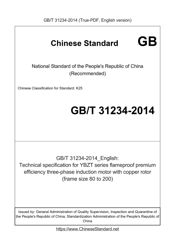 Delivery: <= 4 days. True-PDF full-copy in English will be manually translated and delivered via email. GB/T 31234-2014: Technical specification for YBZT series flameproof premium efficiency three-phase induction motor with copper rotor (frame size 80 to 200) Status: Valid