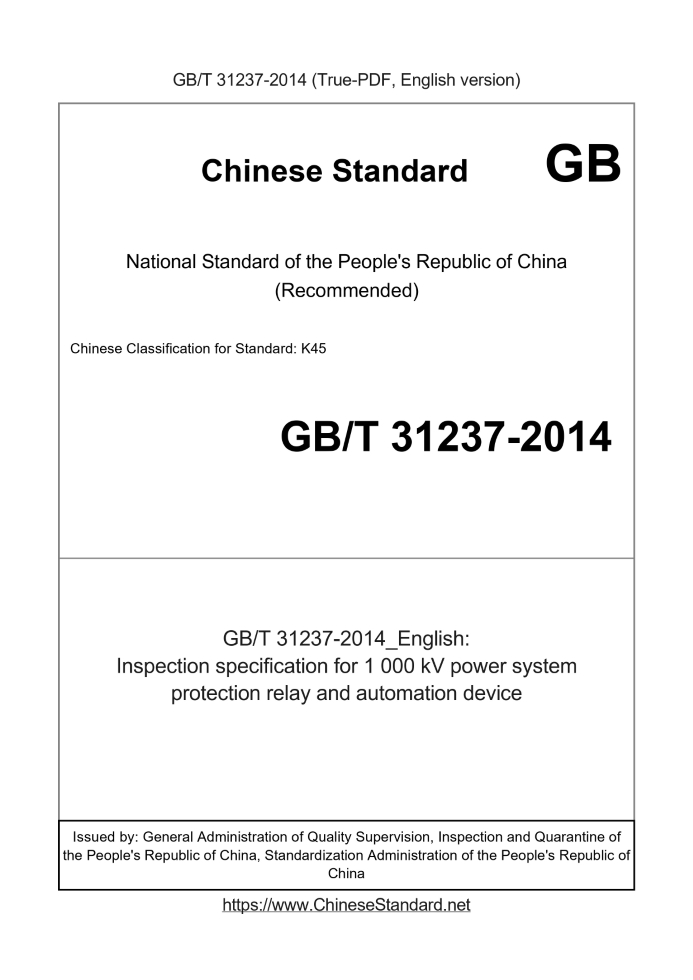 Delivery: <= 4 days. True-PDF full-copy in English will be manually translated and delivered via email. GB/T 31237-2014: Inspection specification for 1 000 kV power system protection relay and automation device Status: Valid