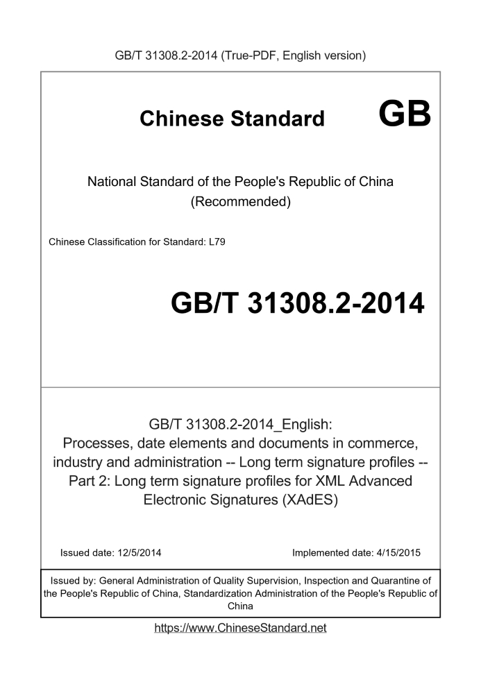 Delivery: <= 3 days. True-PDF full-copy in English will be manually translated and delivered via email. GB/T 31308.2-2014: Processes, date elements and documents in commerce, industry and administration -- Long term signature profiles -- Part 2: Long term signature profiles for XML Advanced Electronic Signatures (XAdES) Status: Valid