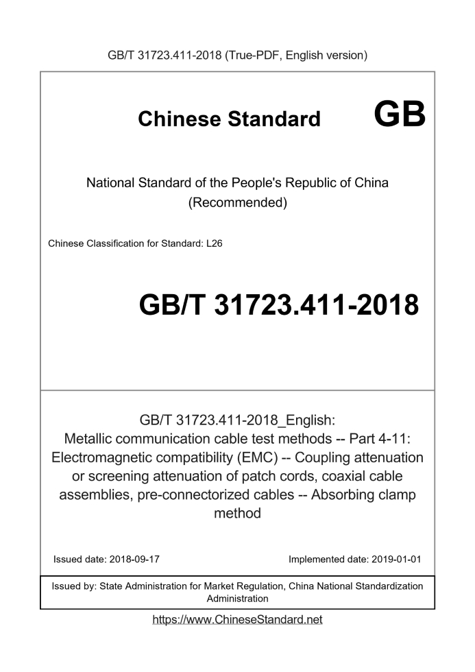 Delivery: <= 3 days. True-PDF full-copy in English will be manually translated and delivered via email. GB/T 31723.411-2018: Metallic communication cable test methods -- Part 4-11: Electromagnetic compatibility (EMC) -- Coupling attenuation or screening attenuation of patch cords, coaxial cable assemblies, pre-connectorized cables -- Absorbing clamp method Status: Valid