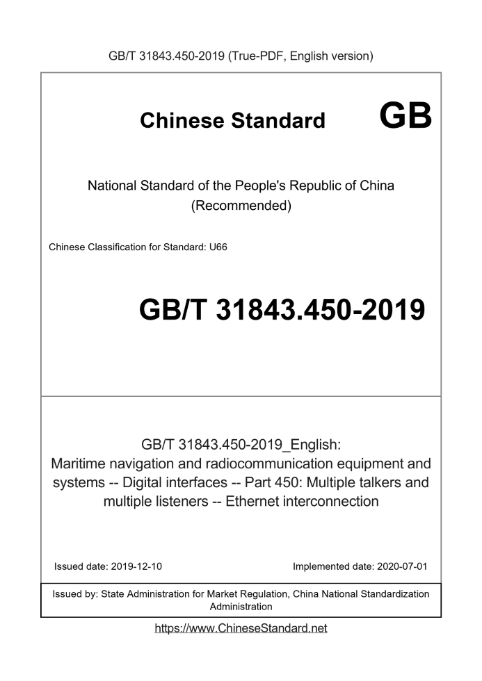 Delivery: <= 10 days. True-PDF full-copy in English will be manually translated and delivered via email. GB/T 31843.450-2019: Maritime navigation and radiocommunication equipment and systems -- Digital interfaces -- Part 450: Multiple talkers and multiple listeners -- Ethernet interconnection Status: Valid