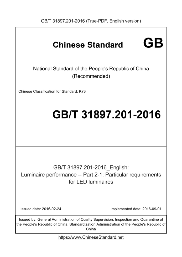 Delivery: <= 3 days. True-PDF full-copy in English will be manually translated and delivered via email. GB/T 31897.201-2016: Luminaire performance -- Part 2-1: Particular requirements for LED luminaires Status: Valid