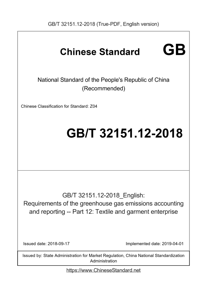 Delivery: <= 4 days. True-PDF full-copy in English will be manually translated and delivered via email. GB/T 32151.12-2018: Requirements of the greenhouse gas emissions accounting and reporting -- Part 12: Textile and garment enterprise Status: Valid