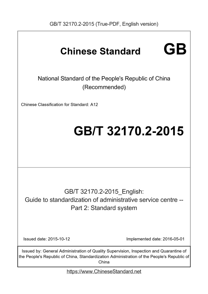 Delivery: <= 3 days. True-PDF full-copy in English will be manually translated and delivered via email. GB/T 32170.2-2015: Guide to standardization of administrative service centre -- Part 2: Standard system Status: Valid
