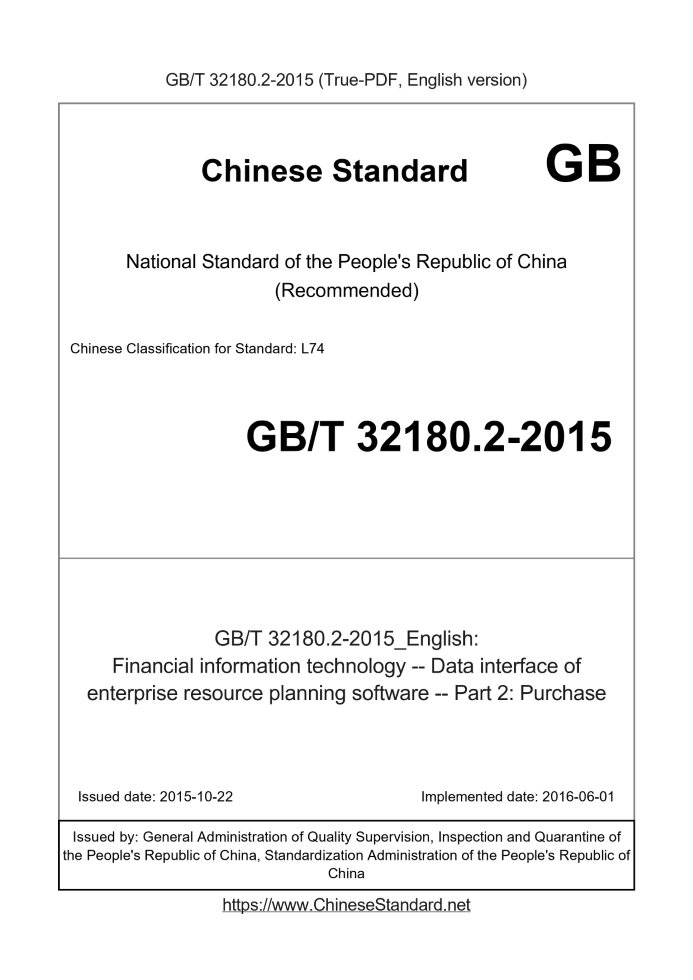 Delivery: <= 10 days. True-PDF full-copy in English will be manually translated and delivered via email. GB/T 32180.2-2015: Financial information technology -- Data interface of enterprise resource planning software -- Part 2: Purchase Status: Valid