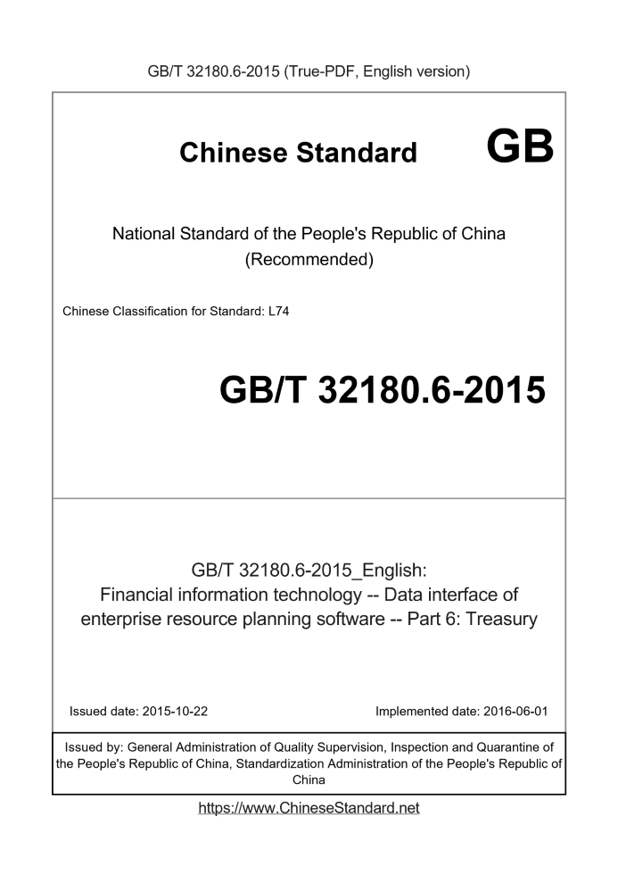 Delivery: <= 13 days. True-PDF full-copy in English will be manually translated and delivered via email. GB/T 32180.6-2015: Financial information technology -- Data interface of enterprise resource planning software -- Part 6: Treasury Status: Valid