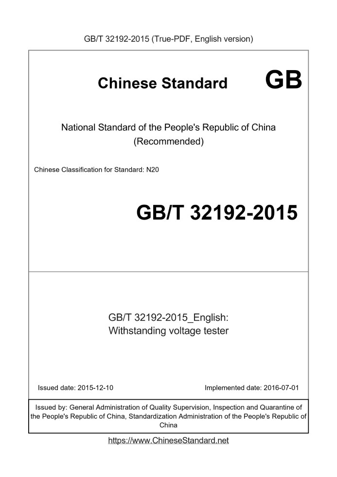 Delivery: <= 5 days. True-PDF full-copy in English will be manually translated and delivered via email. GB/T 32192-2015: Withstanding voltage tester Status: Valid