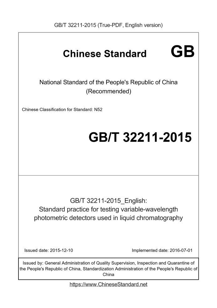 Delivery: <= 3 days. True-PDF full-copy in English will be manually translated and delivered via email. GB/T 32211-2015: Standard practice for testing variable-wavelength photometric detectors used in liquid chromatography Status: Valid