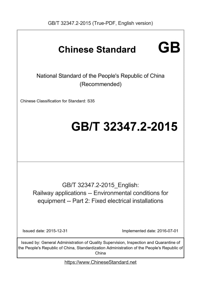 Delivery: <= 3 days. True-PDF full-copy in English will be manually translated and delivered via email. GB/T 32347.2-2015: Railway applications -- Environmental conditions for equipment -- Part 2: Fixed electrical installations Status: Valid