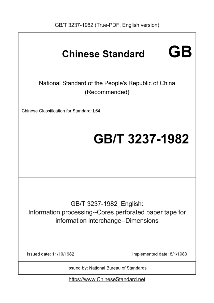 Delivery: <= 2 days. True-PDF full-copy in English will be manually translated and delivered via email. GB/T 3237-1982: Information processing--Cores perforated paper tape for information interchange--Dimensions Status: Obsolete
