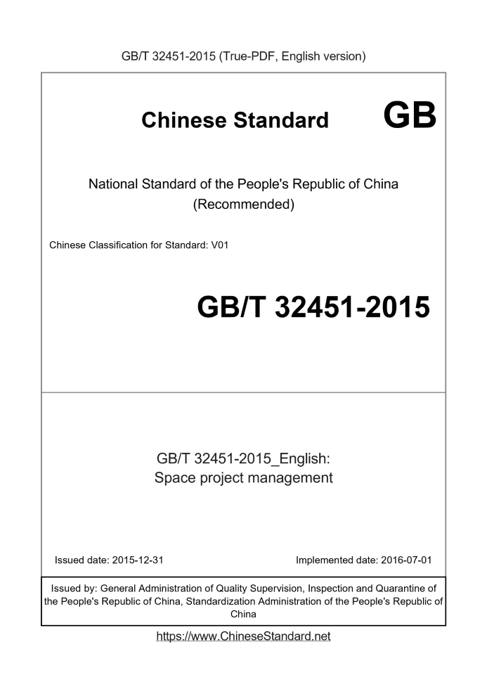 Delivery: <= 6 days. True-PDF full-copy in English will be manually translated and delivered via email. GB/T 32451-2015: Space project management Status: Valid