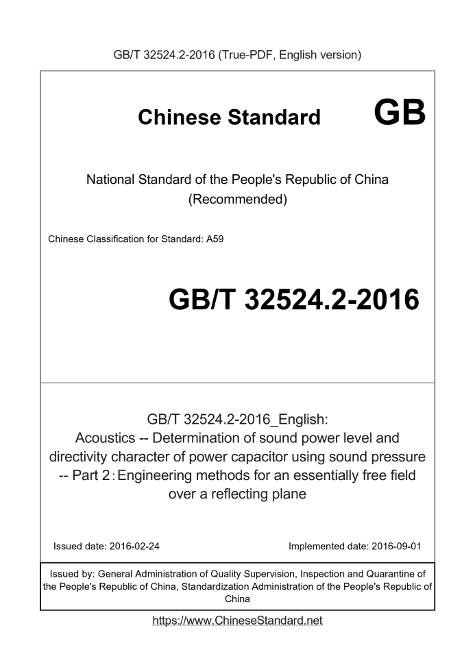 Delivery: <= 6 days. True-PDF full-copy in English will be manually translated and delivered via email. GB/T 32524.2-2016: Acoustics -- Determination of sound power level and directivity character of power capacitor using sound pressure -- Part 2:Engineering methods for an essentially free field over a reflecting plane Status: Valid