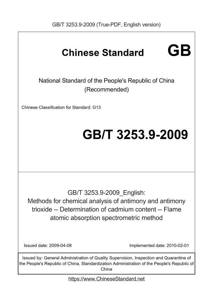 Delivery: <= 3 days. True-PDF full-copy in English will be manually translated and delivered via email. GB/T 3253.9-2009: Methods for chemical analysis of antimony and antimony trioxide -- Determination of cadmium content -- Flame atomic absorption spectrometric method Status: Valid