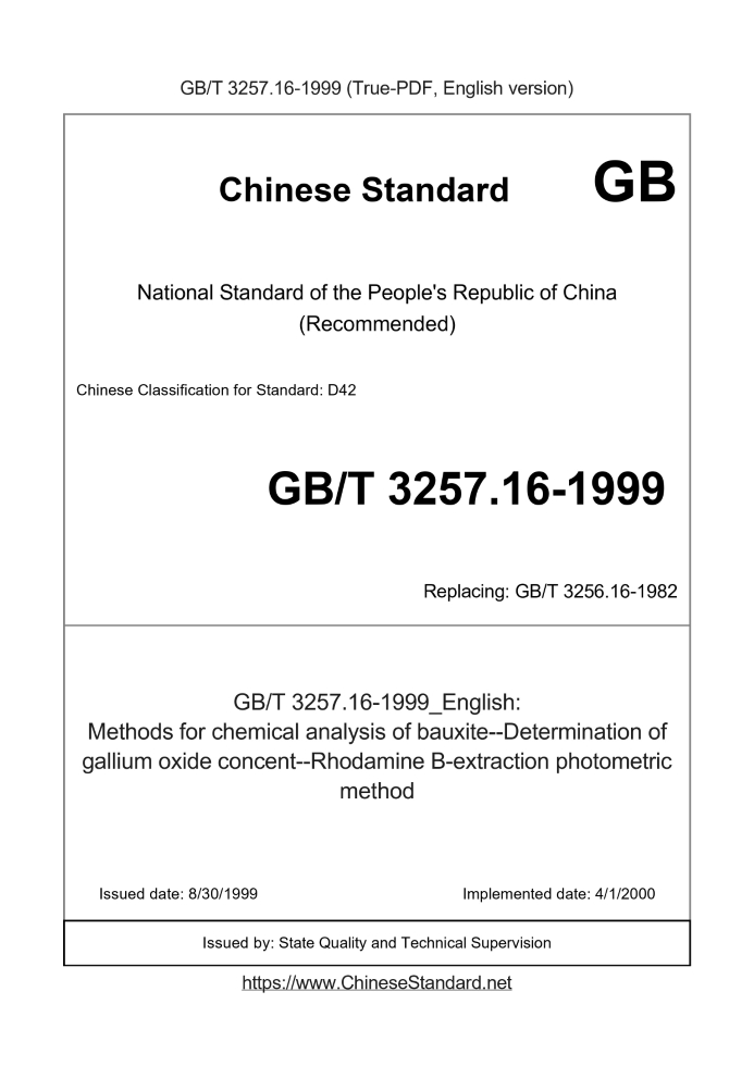 Delivery: <= 3 days. True-PDF full-copy in English will be manually translated and delivered via email. GB/T 3257.16-1999: Methods for chemical analysis of bauxite--Determination of gallium oxide concent--Rhodamine B-extraction photometric method Status: Obsolete GB/T 3257.16: Historical versions