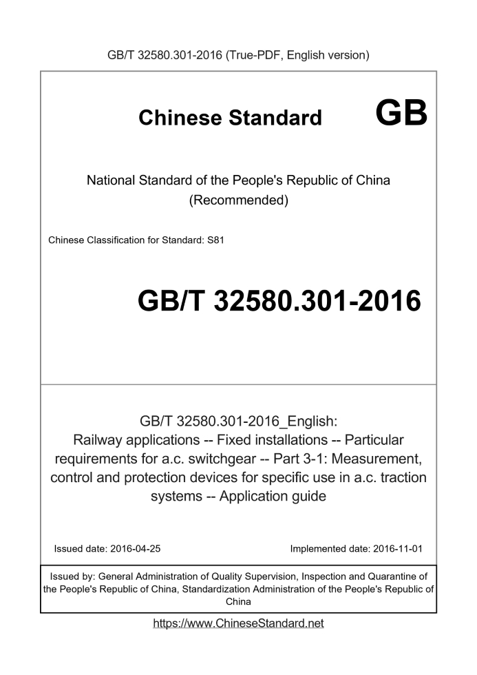 Basic dataStandard ID: GB/T 32580.301-2016 (GB/T32580.301-2016)Description (Translated English): Railway applications -- Fixed installations -- Particular requirements for a.c. switchgear -- Part 3-1: Measurement, control and protection devices for specific use in a.c. traction systems -- Application guide Sector / Industry: National Standard (Recommended) Classification of Chinese Standard: S81 Classification of International Standard: 29.280 Word Count Estimation: 8,835 Date of Issue: 2016-04-25 Date of Implementation: 2016-11-01 Regulation (derived from): National Standard Announcement No Issuing agency(ies): General Administration of Quality Supervision, Inspection and Quarantine of the People's Republic of China, Standardization Administration of the People's Republic of China GB/T 32580.301-2016: Railway applications -- Fixed installations -- Particular requirements for a.c. switchgear -- Part 3-1: Measurement, control and protection devices for specific use in a.c. traction systems -- Application guide---This is a DRAFT version for illustration, not a final translation. Full copy of true-PDF in English version (including equations, symbols, images, flow-chart, tables, and figures etc.) will be manually/carefully translated upon your order. Railway applications - Fixed installations - Particular requirements for acswitchgear - Part 3-1. Measurement, control and protection devices for specific use in actraction systems - Application guide ICS 29.280 S81 National Standards of People's Republic of China Rail transit ground equipment AC switchgear special requirements Part 3-1. AC traction system for special measurement, Control and Protection Device Application Guide Particularrequirementsfora.c.switchgear-Part 3-1. Measurement, controland (IEC 62505-3-1..2009, MOD) 2016-04-25 release.2016-11-01 implementation General Administration of Quality Supervision, Inspection and Quarantine of the People's Republic of China China National Standardization Management Committee released Directory Preface III 1 Scope 1 2 normative reference document 1 3 measurement 1 4 closing control system4.1 Overview 1 4.2 bulletproof function 1 4.3 coincidence time variable and automatic closing of the final lockout 2 4.4 low voltage lockout 2 4.5 Feeder detection device 2 5 protection system 3 5.1 circuit breaker protection system 3 5.2 feeder circuit breaker protection system 3 5.3 Line breaker protection system (if any) 4 5.4 Other requirements 4ForewordGB/T 32580 "Rail Transit Ground Equipment AC Switchgear Special Requirements" is divided into the following sections. - Part 1. Single-phase circuit breakers with Un greater than 1 kV; - Part 2. Single - phase disconnectors with Un greater than 1 kV, earthing switches and load switches; - Part 3-1. Guidance on the application of measurement, control and protection devices for AC traction systems; - Part 3-2. Special measurement, control and protection devices for AC traction systems - Single - phase current transformers; Part 3-3. Special measurement, control and protection devices for AC traction systems Single phase inductive voltage transformers. This part is part 3-1 of GB/T 32580. This part is drafted in accordance with the rules given in GB/T 1.1-2009. This part uses the re-drafting method to modify the use of IEC 62505-3-1..2009 "rail transit ground device AC switchgear special Requirements - Part 3-1. Guidance on the Application of Special Measurement, Control and Protection Devices for AC Traction Systems. The technical differences between this part and IEC 62505-3-1..2009 are as follows. --- removed the first chapter in the range of 16.7Hz, 60Hz voltage, an increase of the nominal voltage of 50kV, in line with the domestic voltage characteristics; --- modified Chapter 3 reference file, with GB/T 32580.302 instead of IEC 62505-3-2, GB/T 32580.303 instead of IEC 62505-3-3, uniform requirements; --- modified 5.2.2 application note, further clarified the requirements; --- increased 5.4, clear with the external interface should be necessary to prevent overvoltage measures. Editorial changes made in this section are. --- delete the original reference. This section is made by the National Railway Administration. This part is headed by the National Technical Committee for Standardization of Electrical Equipment and Systems (SAC/TC278). This part of the main drafting unit. China Railway Fourth Survey and Design Institute Group Co., Ltd. This part participates in the drafting unit. China Railway Electrification Survey and Design Institute Co., Ltd., Railway Third Survey and Design Institute Group Co., Ltd. This part of the main drafters. Wen Jianmin, Li Jinjun. This part participates in the drafters. Gao Liming, Tian Shengli, Xu Jian, Zhang Tao. Rail transit ground equipment AC switchgear special requirements Part 3-1. AC traction system for special measurement, Control and Protection Device Application Guide1 ScopeThis part of GB/T 32580 specifies the design of traction power supply systems for the exchange of equipment protection, control and measurement systems to provide assistance, guidance and Claim. This section specifies the characteristics and parameters of measuring, controlling and protecting equipment in AC traction systems and providing the correct use of protection guide. This part is applicable to electrified railway power supply system with nominal voltage of 25kV, 50kV and frequency of 50Hz. Electrical measurement and protection Device.2 normative reference documentsThe following documents are indispensable for the application of this document. For dated references, only the dated edition applies to this article Pieces. For undated references, the latest edition (including all modifications) applies to this document. GB/T 32580.302 Railways - Ground equipment - Particular requirements for AC switchgear - Part 3-2. AC traction system Special measurement, control and protection devices Single-phase current transformers (IEC 62505-3-2..2009, MO