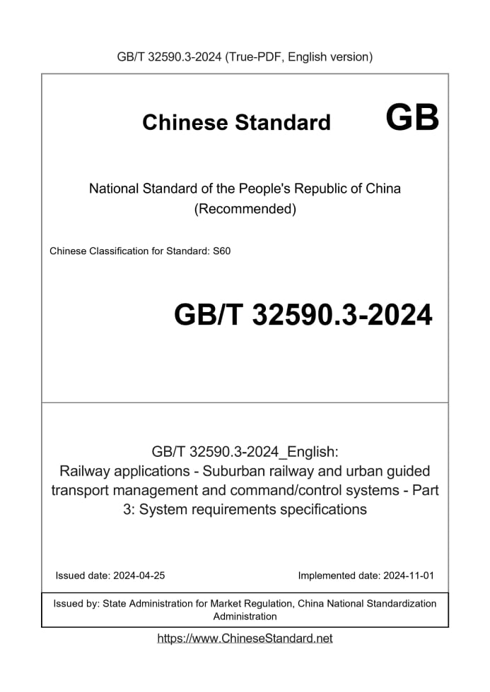Basic dataStandard ID: GB/T 32590.3-2024 (GB/T32590.3-2024)Description (Translated English): Railway applications - Suburban railway and urban guided transport management and command/control systems - Part 3: System requirements specifications Sector / Industry: National Standard (Recommended) Classification of Chinese Standard: S60 Classification of International Standard: 45.020 Word Count Estimation: 214,270 Date of Issue: 2024-04-25 Date of Implementation: 2024-11-01 Issuing agency(ies): State Administration for Market Regulation, China National Standardization Administration GB/T 32590.3-2024: Railway applications - Suburban railway and urban guided transport management and command/control systems - Part 3: System requirements specifications---This is a DRAFT version for illustration, not a final translation. Full copy of true-PDF in English version (including equations, symbols, images, flow-chart, tables, and figures etc.) will be manually/carefully translated upon your order. ICS 45:020 CCSS60 National Standards of People's Republic of China Rail transit, urban rail and urban rail transportation Management and command/control systems Part 3: Systems Requirements Specification specifications (IEC 62290-3:2019, Railway applications - Urban guided transport specifications,MOD) Published on April 25, 2024, implemented on November 1, 2024 State Administration for Market Regulation The National Standardization Administration issued Table of ContentsPreface I Introduction II 1 Scope 1 2 Normative references 1 3 Terms, definitions and abbreviations 1 3:1 Terms and Definitions 1 3:2 Abbreviations 2 4 UGTMS Architecture 2 4:1 Overall system architecture 2 4:2 General description of UGTMS subsystems 4 4:3 External devices 5 4:4 Several assumptions of UGTMS architecture 8 5 UGTMS network description 8 5:1 Overview 8 5:2 Line Section 9 5:3 Track sections 9 5:4 Rules for connecting track sections 10 5:5 Structure and content of network description related configuration data 10 6 Requirements Allocation and Description 11 6:1 UGTMS subsystem functional requirements allocation 11 6:2 Overview of assigned functions and sub-functions of GB/T 32590:2 187 6:3 UGTMS Subsystem Interface Identification 206 Appendix A (Informative) Technical differences between this document and IEC 62290-3:2019 and their causes 205ForewordThis document is in accordance with the provisions of GB/T 1:1-2020 "Guidelines for standardization work Part 1: Structure and drafting rules for standardization documents" Drafting: This document is Part 3 of GB/T 32590 "Rail transit - Urban rail and urban rail traffic management and command/control systems": GB/T 32590 has published the following parts: --- Part 1: System principles and basic concepts; --- Part 2: Functional requirements specification; --- Part 3: System requirements specification: This document is modified to adopt IEC 62290-3:2019 "Rail transit urban rail transit management and command/control systems Part 3 Part 1: System Requirements Specification: This document has many technical differences compared with IEC 62290-3:2019: These technical differences and their reasons are shown in Appendix A: The following editorial changes were made to this document: --- To coordinate with the existing standards, the name of the standard was changed to "Rail Transit, Urban Rail and Urban Rail Transportation Management and Command/Control System System Part 3: System Requirements Specification"; --- "OHMI" and "THMI" are clarified as "external OHMI" and "external THMI" and "component element" is changed to "UGTMS equipment" and and “UGTMS equipped train” is changed to “UGTMS train” (see 6:1:2); --- Deleted the entire text of the external OHMI or external THMI for the use of "display and record" of the received information (see 6:1:2); --- Removed [REQ_5:5:9:3 This document is proposed by the National Railway Administration: This document is under the jurisdiction of the National Rail Transit Electrical Equipment and System Standardization Technical Committee (SAC/TC278): This document was drafted by: CRRC Zhuzhou Electric Locomotive Research Institute Co:, Ltd:, Shanghai Shentong Metro Group Co:, Ltd:, Beijing Railway Communications Signal Research and Design Institute Group Co:, Ltd:, Traffic Control Technology Co:, Ltd:, Beijing Subway Operation Co:, Ltd:, China Railway Fourth Survey and Design Institute Group Co:, Ltd:, Institute of Communications and Signaling, China Academy of Railway Sciences Group Co:, Ltd: The main drafters of this document are: Shang Jing, Lu Xiangyang, Wu Weiping, Lü Haojiong, Lei Chengjian, Wang Daqing, Ma Nengyi, Li Zhiyu, Han Zhen, Wang Wei, Chen Chaolu, Li Xi, Liang Jiubiao, and Sun Wang:IntroductionGB/T 32590 specifies the requirements for urban rail transit and train control systems based on communication for urban rail passenger transport lines and networks: Functional requirements, system requirements and interface requirements of urban rail transportation management and command/control systems of system technology: In this document, the abbreviation for Urban Rail Transit Management and Command/Control System is UGTMS: The wide range of operational requirements from automated train operation (GOA1) to unmanned train operation (GOA4): UGTMS is installed on some lines: GB/T 32590 does not specifically discuss public safety issues, but the safety requirements proposed are used to ensure the safety of urban rail and urban rail transportation: Public safety within the system: The main purpose of GB/T 32590 is to achieve interoperability, interchangeability and compatibility: GB/T 32590 is a recommended document for the introduction of equipment with interoperability, interchangeability and compatibility: How to use GB/T 32590 depends on the specific needs of the specific line to meet the special use requirements of this document: GB/T 32590 is also applicable to upgrading existing signal and command control systems: In this case, only the