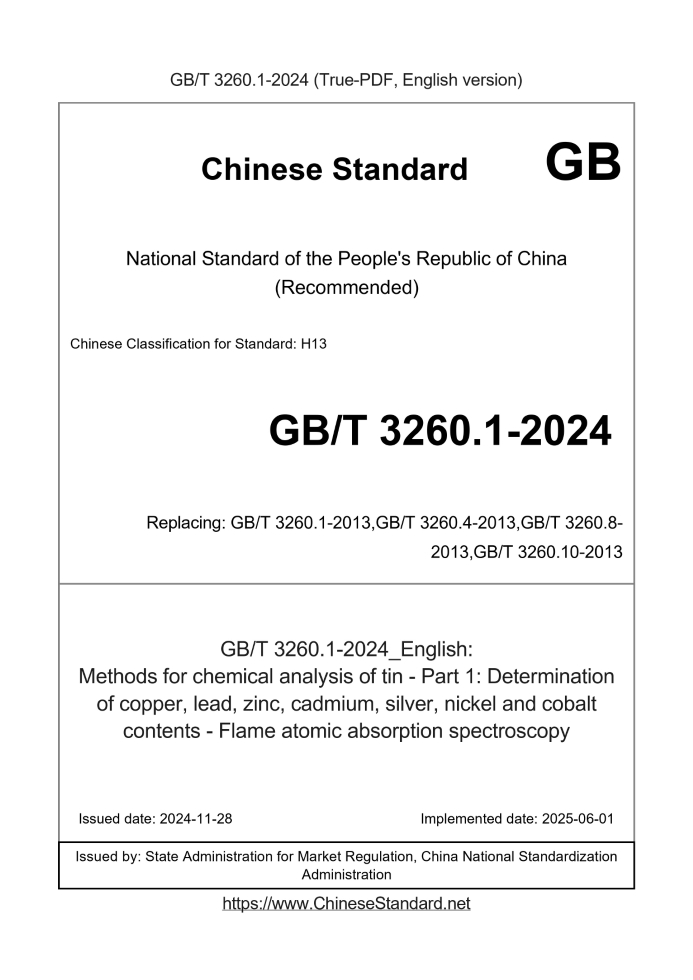 Delivery: <= 3 days. True-PDF full-copy in English will be manually translated and delivered via email. GB/T 3260.1-2024: Methods for chemical analysis of tin - Part 1: Determination of copper, lead, zinc, cadmium, silver, nickel and cobalt contents - Flame atomic absorption spectroscopy Status: Valid GB/T 3260.1: Historical versions