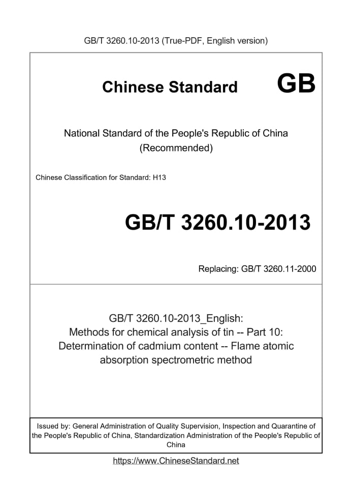 Delivery: <= 3 days. True-PDF full-copy in English will be manually translated and delivered via email. GB/T 3260.10-2013: Methods for chemical analysis of tin -- Part 10: Determination of cadmium content -- Flame atomic absorption spectrometric method Status: Valid GB/T 3260.10: Historical versions
